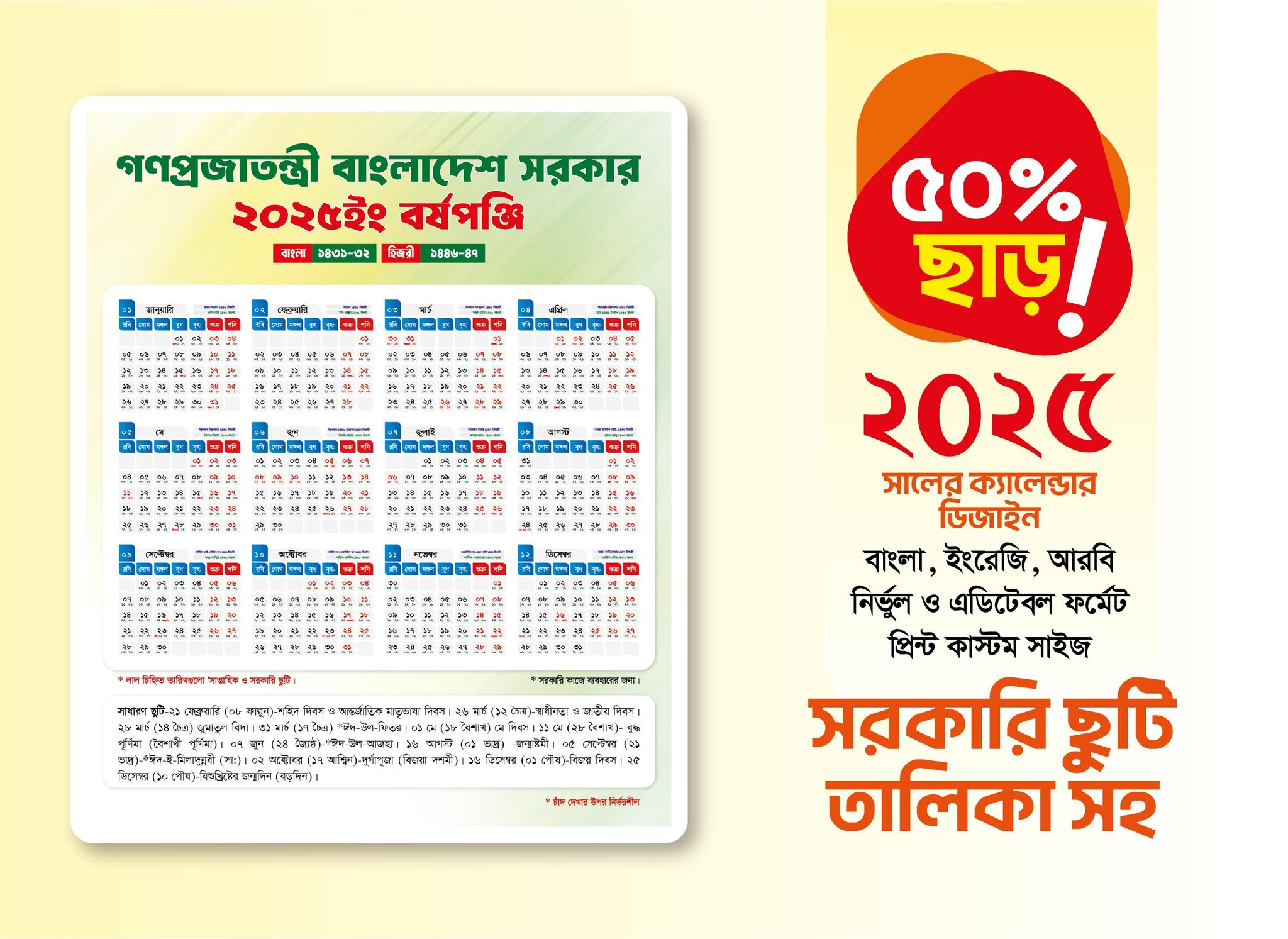 সরকারি ছুটির তালিকা সহ বাংলা, ইংরেজী, আরবী ক্যালেন্ডার 2025